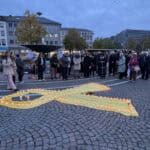 Viele Menschen standen schweigend um eine aus Stoff ausgelegte gelbe Schleife und Stelen mit Fotos zusammen und zündeten Kerzen zum Gedenken an die Opfer des 7. Oktobers 2023, des Massakers