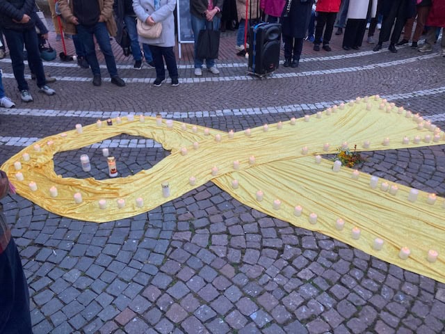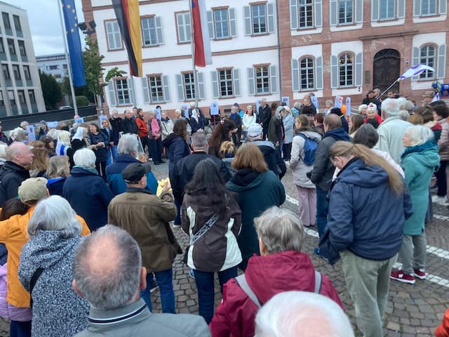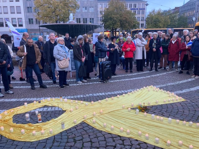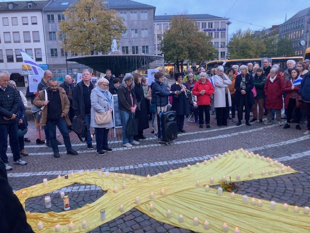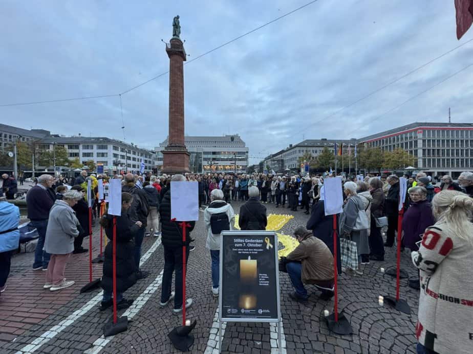 Viele Menschen standen schweigend um eine aus Stoff ausgelegte gelbe Schleife und Stelen mit Fotos zusammen und zündeten Kerzen zum Gedenken an die Opfer des 7. Oktobers 2023, des Massakers der Hamas in Israel, an. Die Kerzen wurden auf der gelben Schleife abgestellt. Diese ist zum Symbol für die Geiseln geworden, von denen 48 noch immer in der Hand der Hamas sind.