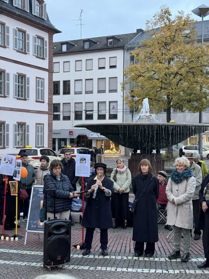 Irith Gabriely gestaltete das Gedenken mit ruhigen Stücken auf der Klarinette und Gesang mit. So erklangen unter anderem das bekannte hebräische Lied „Eli, Eli“ (Mein Gott, mein Gott) und auch „Habaita“ (Nach Hause). Pfarrerin Ilka Friedrich, Referentin für Ökumene und Interreligiösen Dialog im Dekanat, sprach zum Abschluss gemeinsam mit Matthias Becker, leitender Pfarrer des Pastoralraums. Die Veranstaltenden standen noch zu Gesprächen an Tischen bereit. „Dieses Gedenken in Stille hat spürbar Raum für Empathie und Verbundenheit geöffnet“, so Ilka Friedrich über die stille Mahnwache zum 7. Oktober. „Das Zusammenstehen in Trauer und Gedenken hat unser Herz mit jenen verbunden, die um ihre Lieben trauern oder deren Herz durch das erlittene Leid zu schwer geworden ist“, bestätigt Benedikta Caspari, Koordinatorin des katholischen Pastoralraums.