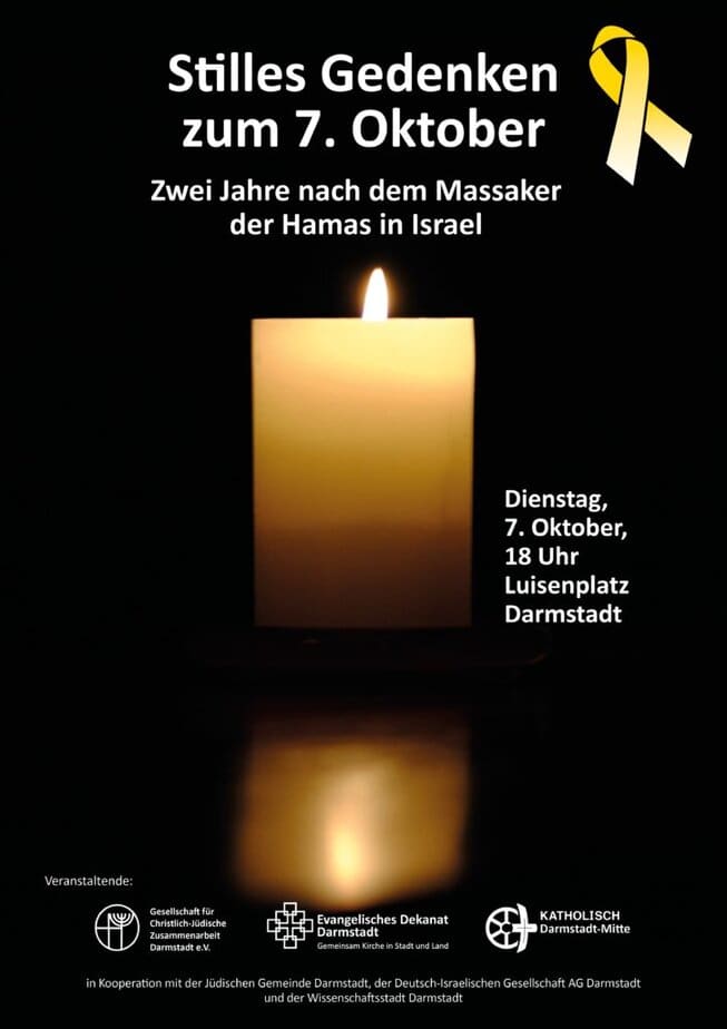 Am Dienstag, 7. Oktober 2025, findet in Darmstadt ab 18 Uhr auf dem Luisenplatz ein stilles Gedenken an die Opfer des Massakers der Hamas vom 7. Oktober 2023 in Israel statt. An diesem Tag wurden mehr als 1200 Männer, Frauen und Kinder ermordet und mehr als 240 Menschen als Geiseln nach Gaza entführt. 48 von ihnen sind noch immer in Geiselhaft.